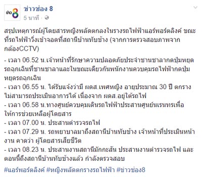 ทั้งนี้ มีรายงานความคืบหน้าเพิ่มเติมระบุว่า หญิงสาวที่เสียชีวิตอายุประมาณ 30 ปี คาดว่าเกิดอาการวูบและพลัดตกลงไปในราง ขณะรถไฟกำลังจะเข้าที่สถานี ทำให้ถูกทับเสียชีวิตคาที่ โดยผู้โดยสารที่เห็นเหตุการณ์พยายามจะเข้าช่วยเหลือ แต่จังหวะนั้นรถไฟมาพอดี จึงทำให้เกิดเหตุสลดขึ้น