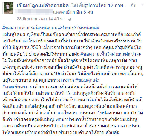 #เหตุเกิดเพราะ เค้าเคยทะเลาะกับแม่หนู ครั้งหนึ่งแล้วตำรวจมาเคลียร์ให้ แล้วก็เงียบกันไป แล้วพอมาวันที่ 13 แม่หนูพูดถึงเรื่องจัดที่ขายของกับเพื่อนอีก 2 คน บอกว่าใครไปถึงก่อนตั้งก่อนเค้าจัดกันไว้แล้วที่สนามกีฬาเค้าจัดเต็มแล้ว แล้วฝั่งนู้นลูกเค้าเข้าใจผิดว่าแม่หนูจะจัดเค้าเลยถือเหล็กมา ส่วนแม่เค้าถือเก้าอี้ แล้วก็มีปากเสียงกัน แม่หนูคว้าไม้ป้องกันตัว แต่ก็ไม่ได้ตีเค้า เค้าสองคนรุมตีแม่หนู พอมาช่วงเอาน้ำร้อนราดลูกเค้าดึงผมแม่หนูและเอาตีนเหยียบคอแม่หนูไว้ แล้วแม่เค้าเอาน้ำร้อนราดเค้าบอกเอาแม่หนูให้ตาย และเค้าบอกว่าถ้าใครเข้ามาช่วยเค้าเอาให้ตาย ด้วยค่ะ