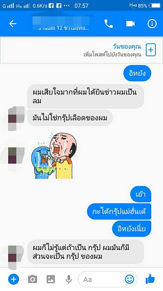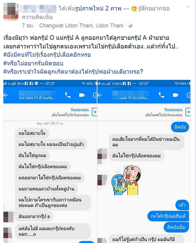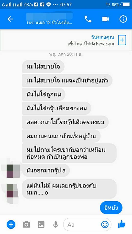 โดยในแชทฝ่ายชายยังบอกอีกด้วยว่า ถามคนทั้งหมู่บ้านแล้วก็บอกว่าหน้าเหมือนตัวเอง แต่ตนคิดว่าถ้าเป็นลูกตนจริง ต้องออกมากรุ๊ป O