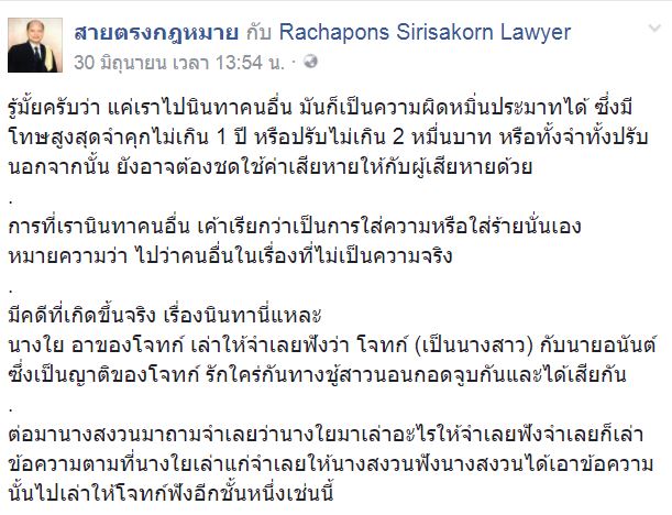 เพจสายตรงกฎหมาย ระบุว่า นี่เป็นเรื่องที่เกิดจากการนินทาจริง ๆ แม้จำเลยจะไม่ได้มีเจตนานินทาโจทก์ แค่เล่าให้ฟังก็ตาม แต่ศาลก็มองว่าทำให้โจทก์เสียหาย และจำเลยก็ควรจะรู้ว่ามันจะทำให้โจทก์เสียหาย จำเลยจึงต้องรับโทษไป