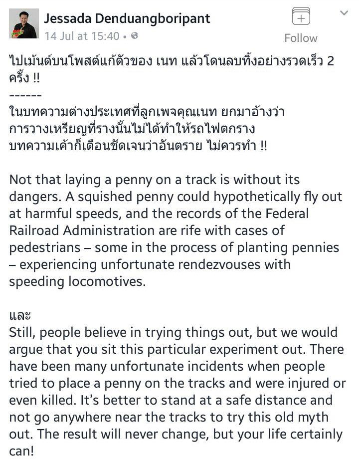 โดยเมื่อวันที่ 14 กรกฎาคม 2560 ภายในเฟซบุ๊ก Jessada Denduangboripant ของ อาจารย์เจษฎา เด่นดวงบริพันธ์ ได้ออกมาเปิดเผยว่า ตนได้เข้าไปแสดงความเห็นบนโพสต์เฟซบุ๊กที่ My Mate Nate ได้ออกมาชี้แจง แต่ความเห็นของตนกลับถูกลบทิ้งถึง 2 ครั้ง โดยสิ่งที่ชี้แจงคือบทความต่างประเทศที่ทางลูกเพจของเนทนำมาแชร์เพื่ออ้างว่า การวางเหรียญบนรถไฟนั้นไม่สามารถทำให้รถไฟตกรางได้ ซึ่งมันเป็นเรื่องจริง แต่มันเป็นการนำเนื้อมาไม่ครบถ้วน เพราะตัวบทความก็มีส่วนที่ระบุชัดเจนว่าถึงแม้จะไม่ทำให้รถไฟตกราง แต่มันก็ยังอันตรายมาก
