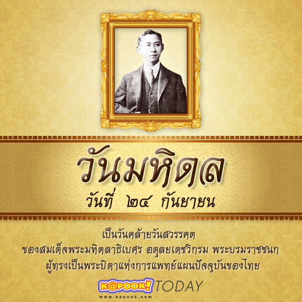 วันมหิดล 24 กันยายน ของทุกปี เป็นวันคล้ายวันสวรรคตของสมเด็จพระมหิตลาธิเบศร อดุลยเดชวิกรม พระบรมราชชนก