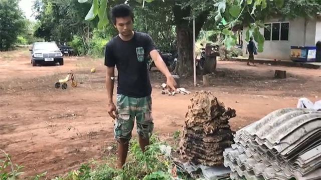 แต่ขณะที่ปีนต้นปีบเพื่อฟันกิ่งทิ้งดันไปตัดโดนกิ่งที่มีรังต่อขนาดใหญ่ร่วงหล่นลงพื้น