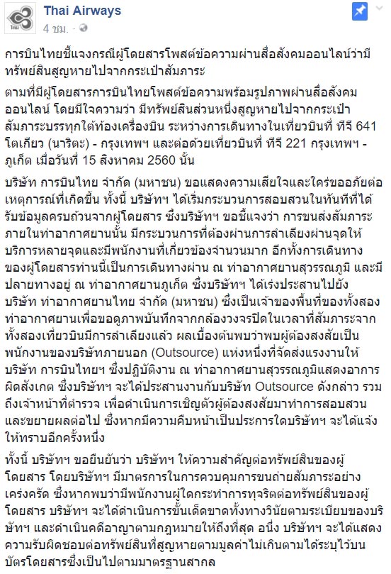 จากกรณี เฟซบุ๊กเพจท่องเที่ยว THE SNAP THAILAND ออกมาบอกเล่าถึงประสบการณ์ถูกโจรขโมยของมีค่า เป็นนาฬิกาจำนวน 8 เรือน ที่ซื้อมาจากประเทศญี่ปุ่น รวมมูลค่ากว่า 25,000 บาท โดยใส่ไว้ในกระเป๋าสัมภาระที่โหลดลงใต้เครื่อง ของสายการบินการบินไทย เส้นทางขากลับจาก นาริตะ-สุวรรณภูมิ-ภูเก็ต เมื่อวันที่ 15 สิงหาคม ที่ผ่านมา