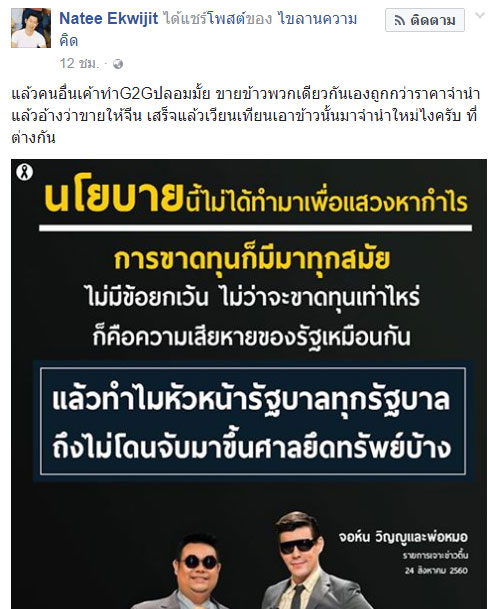 ต่อมา เฟซบุ๊ก Natee Ekwijit ของอุ๋ย บุดด้า เบลส นักร้องชื่อดัง ได้มีการโพสต์แสดงความคิดเห็นเกี่ยวกับกรณีนี้ ว่า "แล้วคนอื่นเค้าทำ G2G ปลอมมั้ย ขายข้าวพวกเดียวกันเองถูกกว่าราคาจำนำแล้วอ้างว่าขายให้จีน เสร็จแล้วเวียนเทียนเอาข้าวนั้นมาจำนำใหม่ไงครับ ที่ต่างกัน"