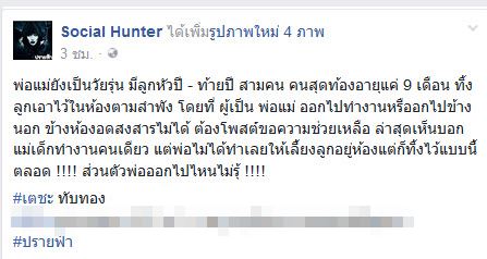 วันที่ 30 สิงหาคม 2560 เพจเฟซบุ๊ก Social Hunter เผยเรื่องราวของเด็กน้อย 3 คน ซึ่งถูกพ่อแม่ทิ้งให้อยู่ที่ห้องกันตามลำพังเป็นประจำ ส่งผลให้ผู้ที่ได้พบเห็นต่างเกิดความสงสารและเวทนาเป็นอย่างมาก