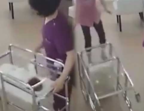 เข็นรถที่มีเด็กอ่อนนอนอยู่ แต่ด้วยท่าไหนก็ไม่ทราบทำให้รถเข็นล้มจนเด็กกระเด็นตกพื้น พยาบาลท่านอื่นเห็นจึงรีบเข้ามาอุ้มทันที และครอบครัวของเด็กทารกได้ว่าจ้างทนายเพื่อเตรียมดำเนินคดีทางกฎหมาย หลังจากปฏิเสธการจ่ายเงินชดเชย แม้เด็กจะไม่พบการบาดเจ็บ แต่ผู้เชี่ยวชาญชี้ว่าอาจส่งผลกระทบต่อระบบประสาทในระยะยาวได้