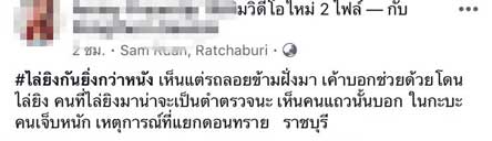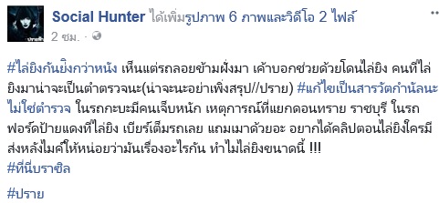 และเพจเฟซบุ๊ก Social Hunter ได้นำเหตุการณ์นี้มาลงโดยระบุว่า "ไล่ยิงกันย่ิ่งกว่าหนัง เห็นแต่รถลอยข้ามฝั่งมา เค้าบอกช่วยด้วยโดนไล่ยิง คนที่ไล่ยิงมาน่าจะเป็นตำรวจนะ (น่าจะนะอย่าเพิ่งสรุป//ปราย) #แก้ไขเป็นสารวัตรกำนันนะไม่ใช่ตำรวจ ในรถกระบะมีคนเจ็บหนัก เหตุการณ์ที่แยกดอนทราย ราชบุรี ในรถฟอร์ดป้ายแดงที่ไล่ยิง เบียร์เต็มรถเลย แถมเมาด้วยอะ อยากได้คลิปตอนไล่ยิงใครมีส่งหลังไมค์ให้หน่อยว่ามันเรื่องอะไรกัน ทำไมไล่ยิงขนาดนี้ !!!