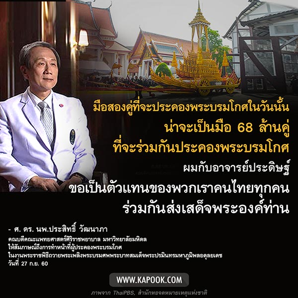 วันที่ 28 กันยายน 2560 รายการเรื่องเล่าเช้านี้ ทางช่อง 3 รายงานว่า เมื่อวานนี้ (27 กันยายน) ศ. ดร. นพ.ประสิทธิ์ วัฒนาภา คณบดีคณะแพทยศาสตร์ศิริราชพยาบาล มหาวิทยาลัยมหิดล กล่าวว่า ในวันที่ 26 ตุลาคม 2560 ตัวหมอเอง และ รศ. นพ.ประดิษฐ์ ปัญจวีณิน ผู้อำนวยการโรงพยาบาลศิริราช ปิยมหาราชการุณย์ จะทำหน้าที่เป็นผู้ประคองพระบรมโกศพระบรมศพ พระบาทสมเด็จพระปรมินทรมหาภูมิพลอดุลยเดช พระผู้เสด็จสู่สวรรคาลัยเป็นครั้งสุดท้าย