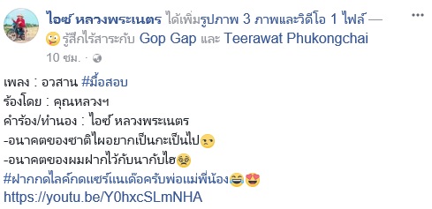 วันที่ 28 กันยายน 2560 ผู้ใช้เฟซบุ๊ก ไอซ์ หลวงพระเนตร ทำเอาโซเชียลต้องแชร์และแสดงความคิดเห็นกันเป็นจำนวนมาก เพราะว่าเขาแต่งเพลงที่โดนใจวัยรุ่นแบบตรง ๆ อย่างเพลง อวสาน มื้อสอบ