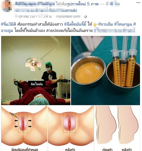 ไม่น่าเชื่อว่าวิวัฒนาการทางการแพทย์จะเปลี่ยนแปลงไปเร็วขนาดนี้ ล่าสุดเพจชื่อดังได้โพสต์ภาพเกี่ยวกับการศัลยกรรมโดยใช้วิธีฉีดไขมันเข้าไปที่อวัยวะเพศหญิง เพิ่มความอิ่มสวย ทำเอาแชร์สนั่นโซเชียล