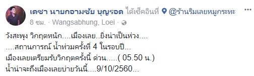 เฟซบุ๊ก เดชา นายกอามชัย บุญรอด โดยในคลิปชายคนหนึ่งกำลังยืนอยู่ในพื้นที่น้ำท่วมสูงระดับถึงเอว บริเวณหน้าร้านริมเลยหมูกระทะ โดยระบุว่าเป็นร้านของตนเอง จากนั้นก็ได้มีการรายงานสถานการณ์น้ำท่วมใน อ.วังสะพุง จ.เลย โดยเล่าว่า
