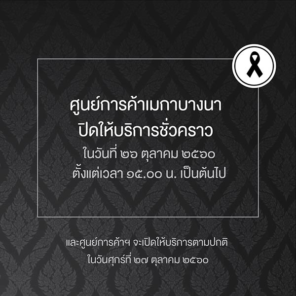 - ศูนย์การค้าเมกาบางนา แจ้งปิดบริการ วันที่ 26 ตุลาคม 60 ตั้งแต่เวลา 15.00 น. เป็นต้นไป โดยจะเปิดให้บริการตามปกติในวันที่ 27 ตุลาคม 2560 และมีบริการรถรับส่งจากสถานีรถไฟฟ้าอุดมสุขให้บริการตามเวลาปกติ 08.00-23.00 น. พร้อมบริการที่จอดรถฟรี ในวันที่ 26 ตุลาคม 2560 จนถึงเวลา 03.00 น. ของวันที่ 27 ตุลาคม 2560