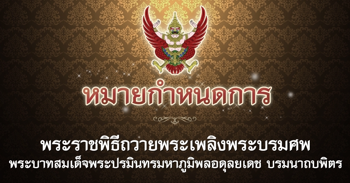 วันที่ 25 ตุลาคม 2560 เว็บไซต์ราชกิจจานุเบกษา ประกาศราชกิจจานุเบกษา รายละเอียดพระราชพิธีถวายพระเพลิงพระบรมศพ พระบาทสมเด็จพระปรมินทรมหาภูมิพลอดุลยเดช บรมนาถบพิตร ณ พระเมรุมาศ ท้องสนามหลวง ดังนี้