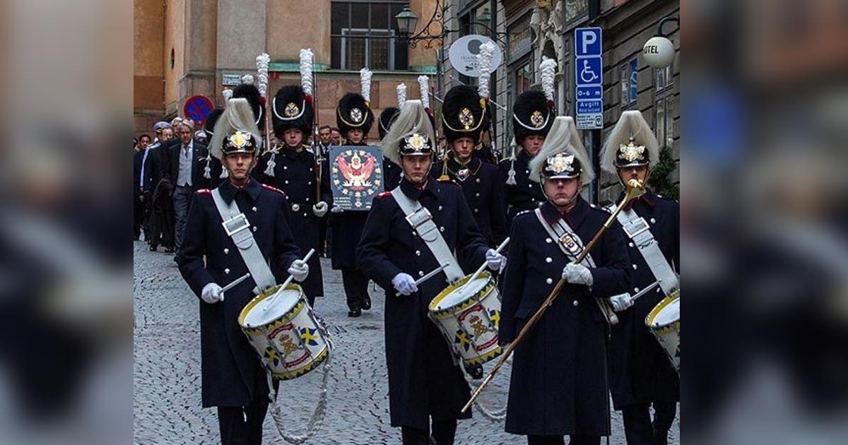 กองทหารเกียรติยศสวีเดน เริ่มพิธีอัญเชิญพระราชลัญจกรพิเศษ เพื่อถวายพระเกียรติยศแด่ ในหลวง รัชกาลที่ 9 ไปยังโบสถ์รีดดาร์โฮล์ม ประกอบพิธีลั่นระฆังมหาเทวา