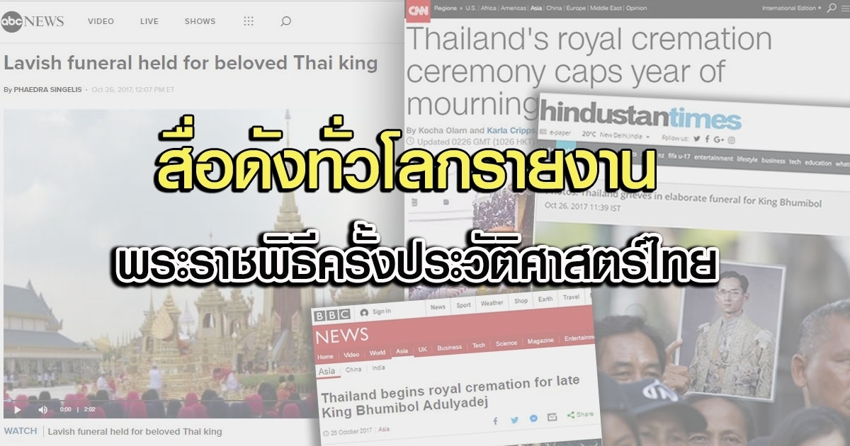 วันที่ 26 ตุลาคม 2560 วันพระราชพิธีถวายพระเพลิงพระบรมศพพระบาทสมเด็จพระปรมินทรมหาภูมิพลอดุลยเดช ในหลวง รัชกาลที่ 9 ของปวงชนชาวไทย พสกนิกรจากทั่วทุกสารทิศ ต่างหลั่งไหลเข้ามาร่วมน้อมส่งเสด็จสู่สวรรคาลัย ผู้ที่ไม่ได้มาร่วมพิธีต่างก็เฝ้าชมการถ่ายทอดสดของโทรทัศน์รวมการเฉพาะกิจแห่งประเทศไทย ซึ่งได้เผยแพร่ภาพไป 177 ประเทศทั่วโลก ซึ่งนอกจากนี้แล้ว สื่อใหญ่ต่าง ๆ ทั่วโลก ต่างก็ร่วมนำเสนอข่าวงานพระราชพิธีฯ ครั้งสำคัญนี้