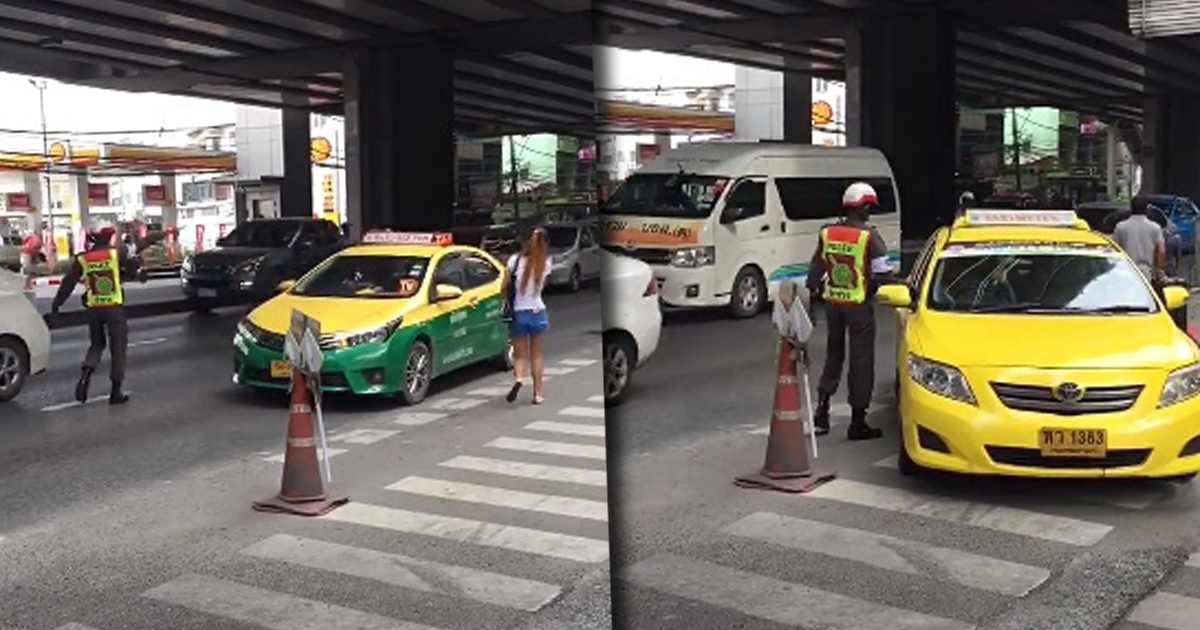 ตำรวจจราจรยืนโบกแท็กซี่ใต้สถานีรถไฟฟ้าอุดมสุข เรียกทุกคันที่ขับผ่านให้จอดแวะ ป้องกันแท็กซี่เลือกรับลูกค้า ชาวเน็ตซึ้งน้ำใจปรบมือชื่นชมรัว ๆ