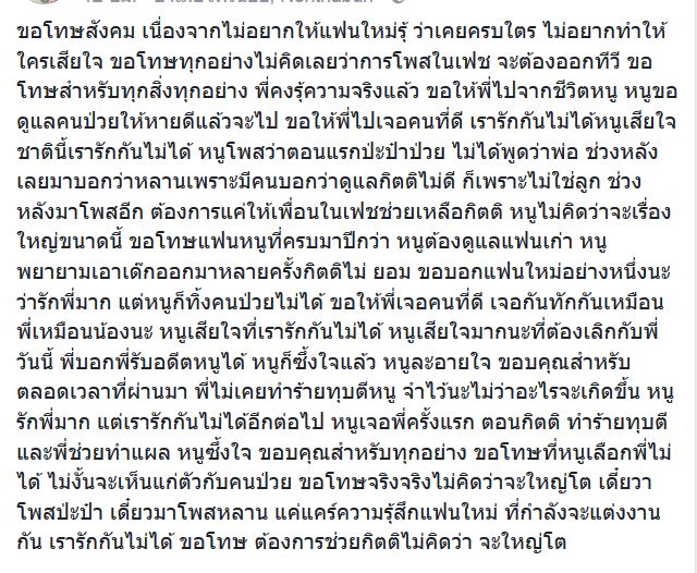 นอกจากนี้ คิตตี้ ยังได้โพสต์สเตตัสตัดพ้อชีวิตที่ต้องเลิกกับแฟนคนปัจจุบันด้วยว่า ไม่อยากให้แฟนรู้ว่าเคยคบกับใคร ตอนนี้ก็ขอให้ไปเจอคนที่ดี ชาตินี้เรารักกันไม่ได้ เพราะจะเห็นแก่ตัวกับคนป่วย ทั้งหมดที่ทำไปเพียงเพราะต้องการจะช่วยกิตติไม่คิดว่าจะใหญ่โต...
