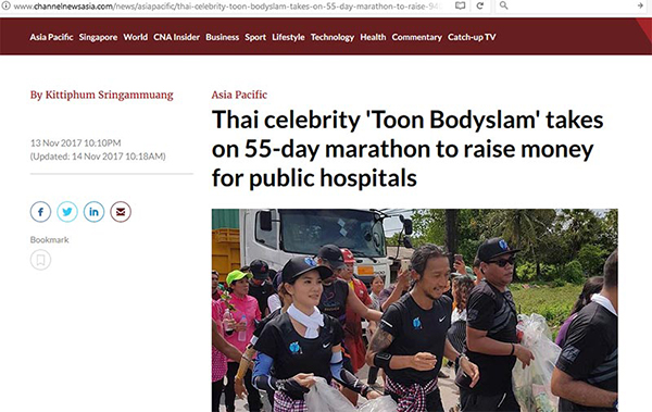 เรื่องราวเปี่ยมแรงบันดาลใจของ ตูน บอดี้สแลม ได้ถูกหยิบยกไปเปิดเผยโดยเว็บไซต์แชนแนลนิวส์เอเชีย เมื่อวันที่ 13 พฤศจิกายน 2560 ระบุว่า ครั้งนี้ไม่ใช่ครั้งแรกที่ ตูน บอดี้สแลม วิ่งมาราธอนการกุศลเพื่อหาเงินช่วยเหลือโรงพยาบาล โดยก่อนหน้านี้ในเดือนธันวาคม 2559 เขาออกวิ่งเป็นระยะทาง 400 กิโลเมตร และได้เงินไปกว่า 63 ล้านบาท แต่ในครั้งนี้เขามีจุดมุ่งหมายที่ยิ่งใหญ่กว่านั้น โดยเขาจะออกวิ่งเป็นเวลา 55 วัน ในระยะทาง 2,191 กิโลเมตร เป้าหมายคือเงินบริจาค 700 ล้านบาท ซึ่งเรื่องที่น่าประทับใจก็คือ ถึงแม้ว่าเขาจะยังไปไม่ถึงจุดหมาย แต่คนไทยก็บริจาคช่วยเหลือไปแล้วกว่า 100 ล้านบาท