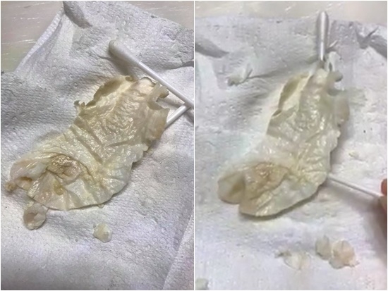 แต่ขณะที่สอดยาเข้าไปได้ส่องกระจก พร้อมกับใช้ไฟฉายส่องบริเวณอวัยวะเพศ ก็พบว่ามีเยื่อสีขาวจึงต้องใช้สำลีคอตตอนบัดชุบน้ำเช็ดออก แล้วเยื่อสีขาวก็หายไป วันถัดมาก็ส่องกระจกดูอีกครั้ง ก็พบเยื่อสีขาวเป็นก้อนอยู่ในอวัยวะเพศ จึงลองเบ่งคล้ายกับคนคลอดลูกและใช้นิ้วดึงออกมา แต่มันขาด ทำให้ต้องเบ่งแรงกว่าเดิม พอเอาออกมาได้เลยถ่ายคลิปส่งให้แม่ที่อยู่ประเทศไทยดู ซึ่งตอนนี้ไม่มีเยื่อสีขาวตกค้างด้านในแล้ว เหลือแต่แผลคล้ายกับแผลร้อนในตรงรอบอวัยวะเพศ