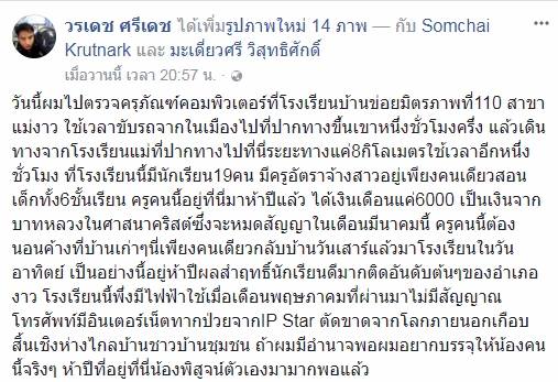 ขณะเดียวกันพบว่า ครูสา ต้องนอนค้างที่บ้านเก่า ๆ แถวโรงเรียนเพียงคนเดียว โดยกลับบ้านวันเสาร์ แล้วมาโรงเรียนในวันอาทิตย์ เป็นอย่างนี้อยู่ห้าปี แต่ผลของความทุ่มเทของเธอนั้น ทำให้นักเรียนมีผลการเรียนดีมากติดอันดับต้น ๆ ของอำเภองาว ส่วนโรงเรียนนี้พึ่งมีไฟฟ้าใช้เมื่อเดือนพฤษภาคมที่ผ่านมา ไม่มีสัญญาณโทรศัพท์ มีแค่อินเทอร์เน็ตจาก IP Star โดยโรงเรียนห่างไกลบ้านชาวบ้านชุมชน และตัดขาดจากโลกภายนอกเกือบสิ้นเชิง และอยากให้ผู้ที่เกี่ยวข้องช่วยให้ ครูสา รายนี้ได้บรรจุเพราะเป็นสิ่งที่เธอสมควรได้รับ