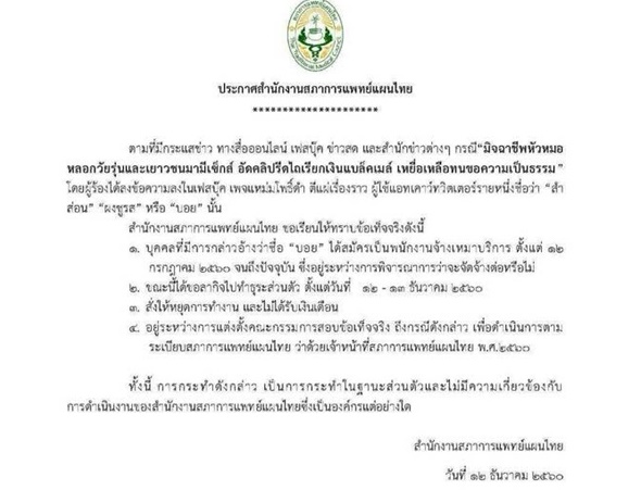 สำนักงานสภาการแพทย์แผนไทย ออกประกาศ เผย บอย แบล็กเมล เคยสมัครเป็นลูกจ้าง แต่ตอนนี้ได้สั่งให้หยุดงาน และไม่ได้รับเงินเดือน ก่อนตั้งกรรมการสอบต่อไป