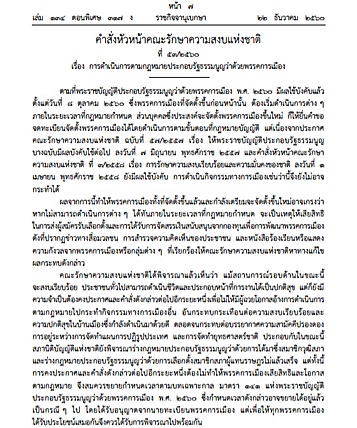 ราชกิจจานุเบกษา เผยแพร่คำสั่งหัวหน้าคณะรักษาความสงบแห่งชาติ ใช้ ม.44 ปลดล็อกขยายเวลาให้จัดตั้งพรรค ต้องยืนยันสมาชิก พร้อมห้ามคนไม่ผ่านคุณสมบัติ วันที่ 22 ธันวาคม 2560 เว็บไซต์ราชกิจจานุเบกษา เผยแพร่คำสั่ง พล.อ. ประยุทธ์ จันทร์โอชา หัวหน้าคณะรักษาความสงบแห่งชาติ ที่ 53/2560 เรื่องการดำเนินการตามกฎหมายประกอบรัฐธรรมนูญว่าด้วยพรรคการเมือง โดยระบุว่า ตามที่พระราชบัญญัติประกอบรัฐธรรมนูญว่าด้วยพรรคการเมือง พ.ศ.2560 มีผลใช้บังคับแล้วตั้งแต่วันที่ 8 ตุลาคม 2560 ซึ่งพรรคการเมืองที่จัดตั้งขึ้นก่อนหน้านั้น ต้องเริ่มดําเนินการต่าง ๆ ภายในระยะเวลาที่กฎหมายกําหนด