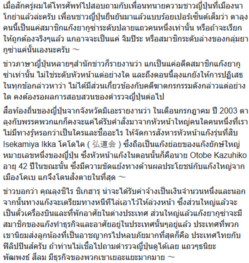 จะอย่างไรก็ดี ถ้าผิดจริงและจับตัวได้ก็ถือว่าเป็นเรื่องที่ดีและเพื่อไม่ให้เกิดเหตุในบ้านเราอีกด้วย และสำหรับใครอยากรู้ที่มาที่ไปของแก๊ง ยากูซ่า สามารถอ่านเพิ่มได้ (เปิด 15 ข้อ เบื้องลึกแก๊ง ยากูซ่า องค์กรทรงอิทธิพลจากแดนอาทิตย์อุทัย)