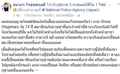 สืบเนื่องจาก (10 มกราคม 2561) เจ้าหน้าที่ตำรวจเมืองลพบุรี สามารถจับกุมตัว นายชิเนฮารุ ชิราอิ อายุ 74 ปี สัญชาติญี่ปุ่น ผู้ต้องหาก่อเหตุฆาตกรรมหัวหน้าแก๊งคู่อริที่ประเทศญี่ปุ่น เมื่อปี 2546 ซึ่งได้หลบหนีคดีมากบดานที่ประเทศไทย ตามที่มีรายงานไปนั้น (อ่านข่าว : จับยากูซ่าวัย 74 หนีคดีฆ่ากบดานไทย - โดนจับเพราะโชว์ลายสักลงโซเชียล !)