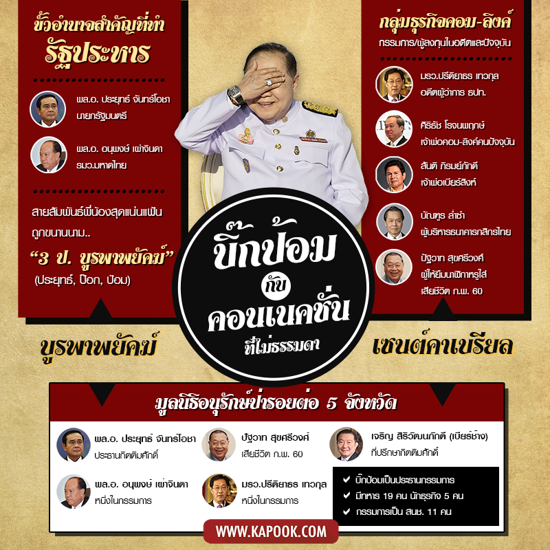 มูลนิธิอนุรักษ์ป่ารอยต่อ 5 จังหวัด เป็นมูลนิธิเพื่อสังคมที่หากพิจารณาจากรายชื่อแล้วจะพบว่าเป็นเครือข่ายเพื่อนพ้องน้องรักของบิ๊กป้อมทั้งหมด มีกรรมการอยู่ทั้งหมด 24 คน โดยเป็นทหาร 19 นาย และเป็นอดีตข้าราชการ-นักธุรกิจอีก 5 คน