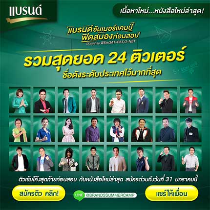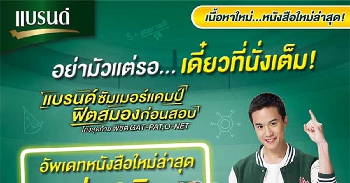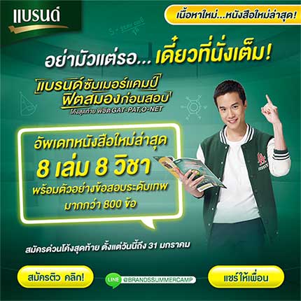 หลังจากที่ระบบการสอบเข้ามหาวิทยาลัยเปลี่ยนระบบใหม่มาเป็น TCAS ทำให้น้องๆมีเวลาเตรียมตัวสอบกันค่อนข้างน้อย แบรนด์เล็งเห็นถึงความสำคัญเลยจัดติวโค้งสุดท้ายก่อนสอบในวันที่ 11-15 กุมภาพันธ์ 2561 นี้ทั้ง 4 ภาค โดยสามารถดูตารางติวได้ที่นี่ http://www.brandssummercamp.com/calendar (ติวสดทุกวันเฉพาะ กทม.) เพื่อพี่ๆม.6 ติวเสร็จแล้วจะได้เข้าห้องสอบได้เลย โดย วิชาที่เปิดตัวฟรีปีนี้ วิชาสามัญ: วิทยาศาสตร์ คณิตศาสตร์ อังกฤษ ภาษาไทย สังคมศึกษา ฟิสิกส์ เคมี ชีววิทยาและ GAT: ความคิดเชื่อมโยง