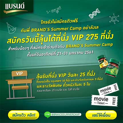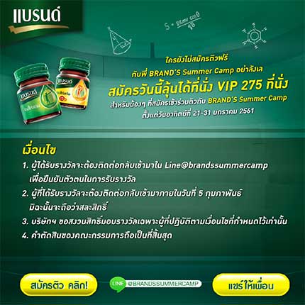 สมัครด่วนภายใน 31 มกราคม 2561 www.brandssummercamp.com ก่อนปิดรับสมัคร แอบกระซิบว่าแบรนด์ยังแจกที่นั่ง VIP วันละ 25 ที่นั่งทุกวันอีกด้วยนะ รีบสมัครก่อนเต็ม