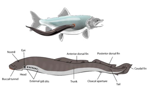 และจากภาพ คือ ปลาแลมป์เพรย์ ที่เป็นปรสิต จะมีปากคล้ายแว่นดูดและมีอุ้งปาก จะใช้ปากเกาะเหยื่อและใช้ฟันและลิ้นครูดเอาเนื้อออก เพื่อให้เลือดของเหยื่อไหลผ่านได้สะดวก ปลาแลมป์เพรย์จะสร้างสารป้องกันการตกตะกอนของเลือดส่งไปที่ปากแผล เมื่อดูดเลือดของเหยื่อจนตัวเหยื่อแห้งก็จะปล่อยแล้วหาเหยื่อใหม่ (อ่านเพิ่มเติม วิกิพีเดีย คลิก)