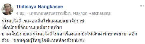 เมื่อวันที่ 3 กุมภาพันธ์ 2561 เฟซบุ๊ก Thitisaya Nangkasee มีการโพสต์เรื่องราวของเด็กคนหนึ่ง ขี่รถจักรยานยนต์ชนท้ายรถยนต์ที่จอดติดไฟแดง ส่งผลให้ได้รับบาดเจ็บจนปากกับคางแตก หัวเข่าซ้ายเป็นแผล