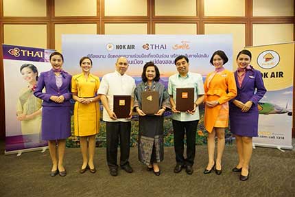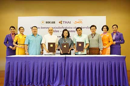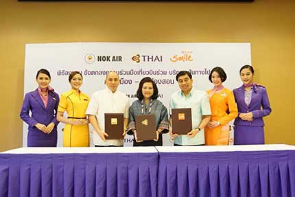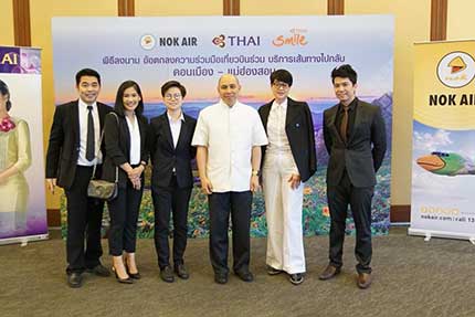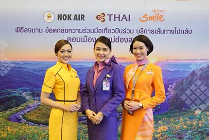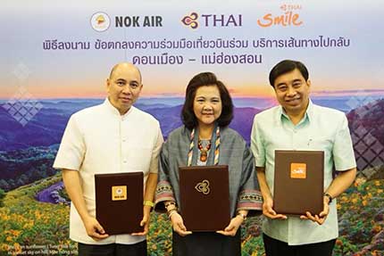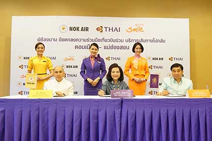 วันนี้ สายการบินนกแอร์ ร่วมกับการบินไทย และไทยสมายล์ ในนามไทยกรุ๊ป (THAI Group) ลงนามในบันทึกข้อตกลงความร่วมมือเที่ยวบินร่วมบริการ เปิดเส้นทางดอนเมือง-แม่ฮ่องสอน เพื่อเป็นการตอบรับนโยบายของรัฐบาลในการกระตุ้นการท่องเที่ยวใน 55 เมืองรอง โดยปัจจุบันนกแอร์ให้บริการบินตรงสู่เมืองรองอยู่แล้วทั้งสิ้น 17 เมือง และแม่ฮ่องสอนจะเป็นอีกหนึ่งเส้นทางใหม่ที่เพิ่มเข้ามา เพื่อเป็นการอำนวยความสะดวกให้แก่ผู้โดยสาร และสร้างบรรยากาศการเดินทางท่องเที่ยวไปยังแม่ฮ่องสอน ให้มีความคึกคักและต่อเนื่องในทุกฤดูกาล