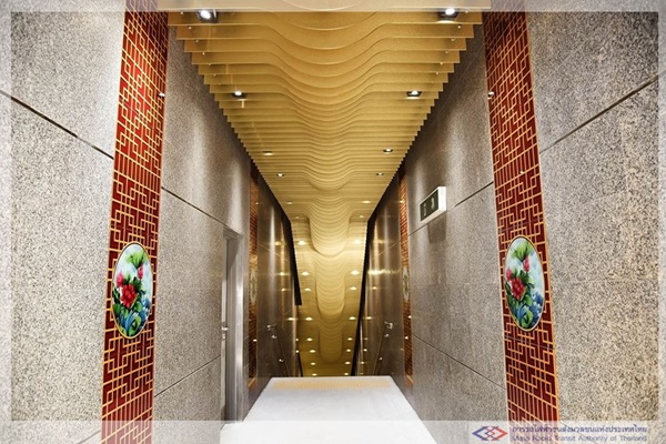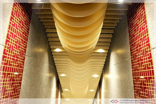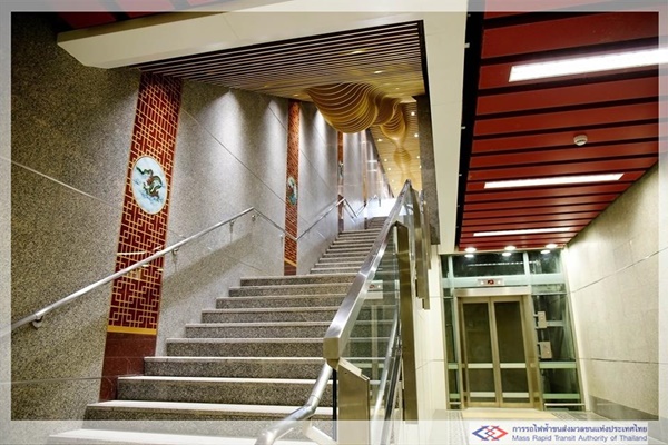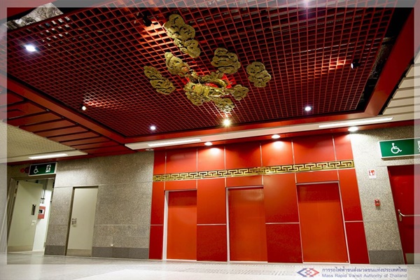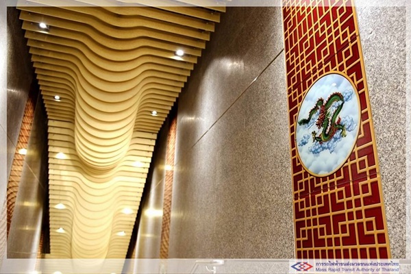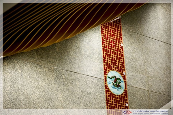 เริ่มต้นตั้งแต่การใช้ลวดลายส่วนหัวและท้องมังกร มาตกแต่งบริเวณทางลงสถานีและเพดาน เพื่อนำสายตาลงไปยังชั้นจำหน่ายตั๋ว และมีการใช้ลวดลายมังกรสลับกับลายดอกบัวประดับบนผนังทั้งสองด้านตลอดแนวทางเดิน นอกจากนี้ ยังมีการติดตั้งลายประแจจีนที่ส่วนหัวเสาสถานี ซึ่งทั้งหมดล้วนตกแต่งด้วยสีแดงสลับกับสีทอง เพื่อให้เกิดความรู้สึกกลมกลืนไปกับวัฒนธรรมไทย-จีน