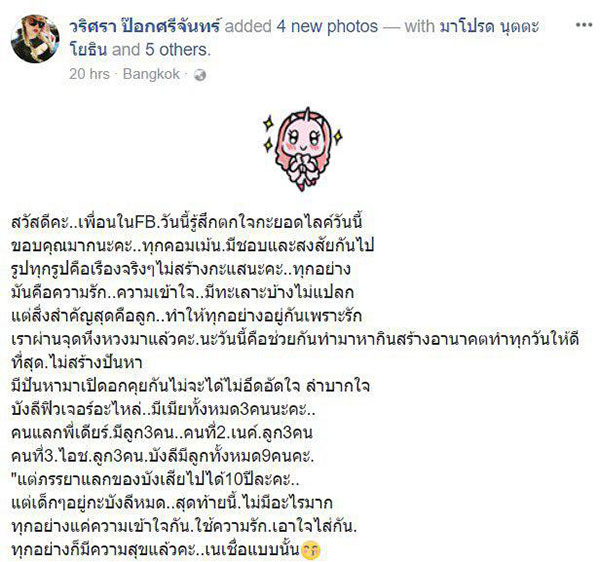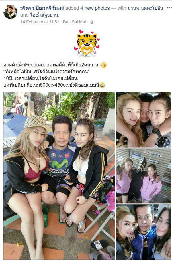กลายเป็นเรื่องราวที่ได้รับความสนใจเป็นอย่างมากบนสังคมออนไลน์ไปเรียบร้อยแล้ว สำหรับเรื่องราว รัก ๆ ของเรา 3 คน ที่ผู้ใช้เฟซบุ๊ก วริศรา ป๊อกศรีจันทร์ ได้โพสต์แชร์เอาไว้เมื่อวันที่ 14 กุมภาพันธ์ 2561 โดยเธอได้โพสต์ภาพผู้ชายคนหนึ่ง มีหญิงสาว 2 คนประกบอยู่ข้าง ๆ พร้อมเขียนแคปชั่นเล่าว่า ผู้ชายในภาพคือสามีของเธอ ส่วนเธอและหญิงสาวอีกคนก็คือภรรยาทั้ง 2 คนของเขา "อวดผัวเต็ม Feed เลย..แต่พอดีผัวพี่มีเมีย 2 คนนาจา ที่เหลือไม่นับ สวัสดีวันแห่งความรักทุกคน"