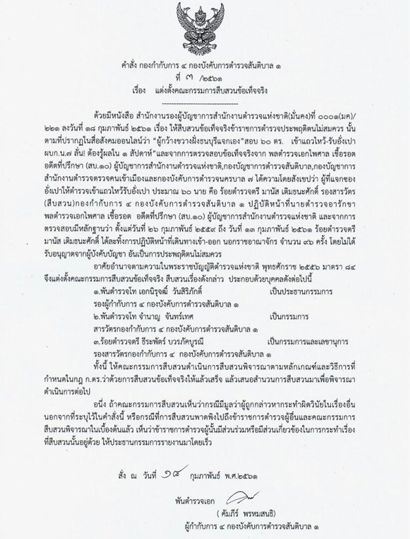 ในเวลาต่อมามีรายงานว่า พล.ต.ต. นพดล ศรสำราญ ผบก.ส.1 ได้มีคำสั่งด่วนที่สุดให้ พ.ต.อ. คัมภีร์ พรหมสนธิ ผกก.บก.ส.1 ปฏิบัติตามคำสั่ง พล.ต.อ. ศรีวราห์ และสั่งการให้ ร.ต.ต. มานัส มารายงานตัวยังต้นสังกัดในวันที่ 19 กุมภาพันธ์ 2561 ซึ่งต่อมา พ.ต.อ. คัมภีร์ ได้มีคำสั่งกองกำกับการ 4 กองบังคับการตำรวจสันติบาล ที่ 3/2561 แต่งตั้งคณะกรรมการสืบสวนข้อเท็จจริง โดยมี พ.ต.ท. เอกนิรุจฒิ์ วันสิริภักดิ์ รอง ผกก.4 บก.ส.1 บช.ส. เป็นประธาน