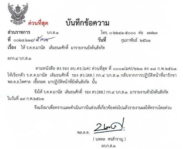 2. ให้เรียกตัว ร.ต.ต. มานัส กลับจากการปฏิบัติหน้าที่อารักขา พล.ต.อ. ไพศาล เชื้อรอด มาปฏิบัติหน้าที่ยังต้นสังกัด