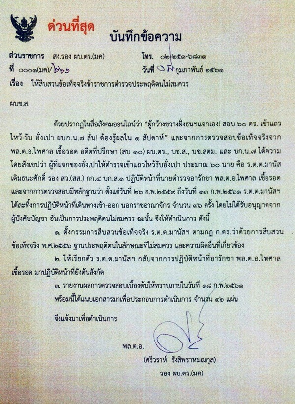 จากการตรวจสอบมีหลักฐานว่าตั้งแต่วันที่ 26 กุมภาพันธ์ 2559 ถึงวันที่ 13 กุมภาพันธ์ 2561 ร.ต.ต. มานัส ได้ละทิ้งการปฏิบัติหน้าที่เดินทางเข้า-ออกนอกราชอาณาจักรจำนวน 96 ครั้ง โดยไม่ได้รับอนุญาตจากผู้บังคับบัญชาอันเป็นการประพฤติตนไม่สมควร ฉะนั้นจึงให้ดำเนินการดังนี้
