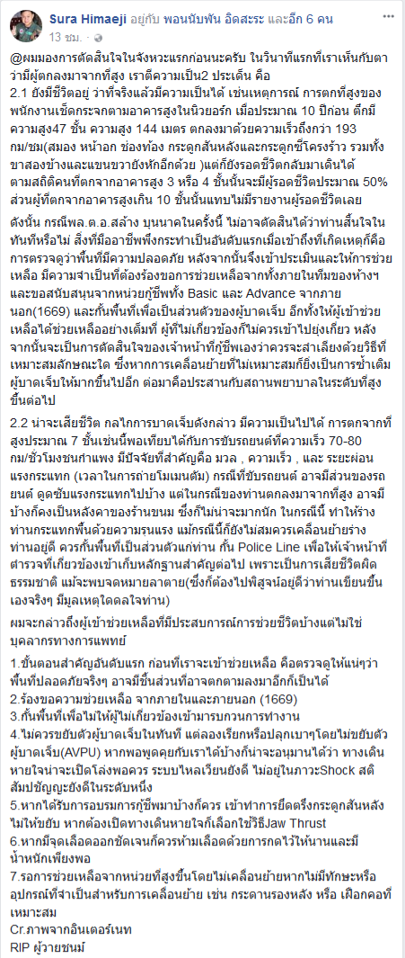 โพสต์ดังกล่าว ระบุว่า สิ่งที่มืออาชีพพึงกระทำเป็นอันดับแรกเมื่อเข้าถึงที่เกิดเหตุก็คือ การตรวจดูว่าพื้นที่มีความปลอดภัย หลังจากนั้นจึงเข้าประเมินและให้การช่วยเหลือ มีความจำเป็นที่ต้องร้องขอการช่วยเหลือจากทั้งภายในทีมของห้าง และขอสนับสนุนจากหน่วยกู้ชีพจากภายนอก และกั้นพื้นที่เพื่อความเป็นส่วนตัวของผู้บาดเจ็บ อีกทั้งให้ผู้เข้าช่วยเหลือได้ช่วยเหลืออย่างเต็มที่ หลังจากนั้นจะเป็นการตัดสินใจของเจ้าหน้าที่กู้ชีพเองว่าควรจะลำเลียงด้วยวิธีที่เหมาะสมลักษณะใด ซึ่งหากการเคลื่อนย้ายที่ไม่เหมาะสมก็ยิ่งเป็นการซ้ำเติมผู้บาดเจ็บให้มากขึ้นไปอีก