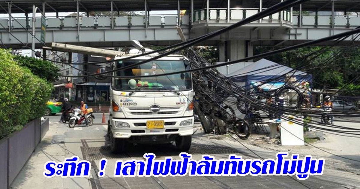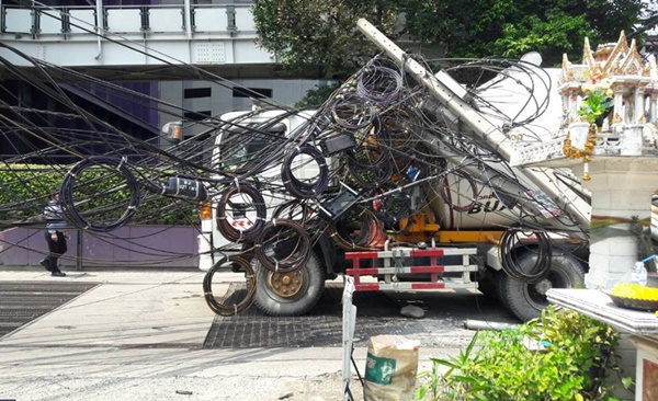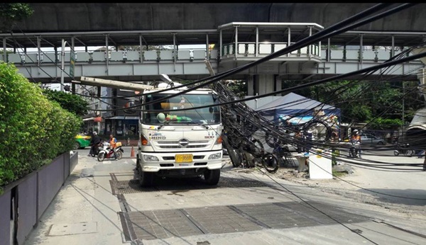 เกิดเหตุเสาไฟฟ้าล้มทับรถโม่ปูน ปากซอยสุขุมวิท 36 สายไฟระโยงระยางทั่วคันรถสุดหวาดเสียว ประชาชนที่ผ่านไป-มา ต่างไม่กล้าเข้าใกล้เพราะยังมีกระแสไฟฟ้าไหลตลอดเวลา