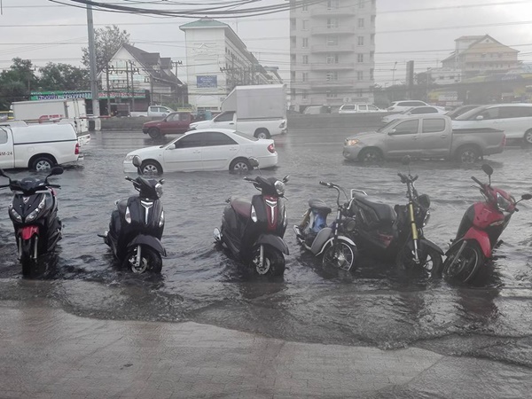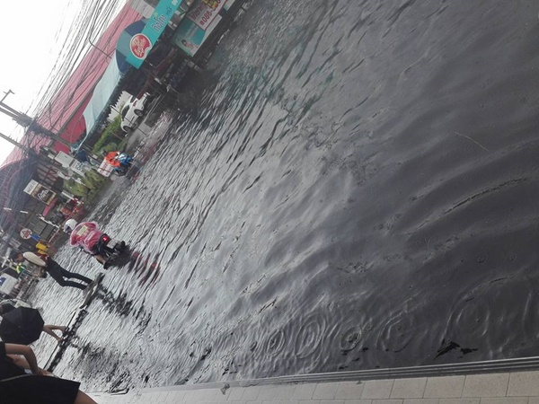 ขณะที่ ซอยรังสิตภิรมย์-ม.กรุงเทพ เกิดฝนตกน้ำท่วมระดับปริ่มฟุตปาธ ส่งผลให้รถบนถนนพหลโยธินติดยาวเหยียด