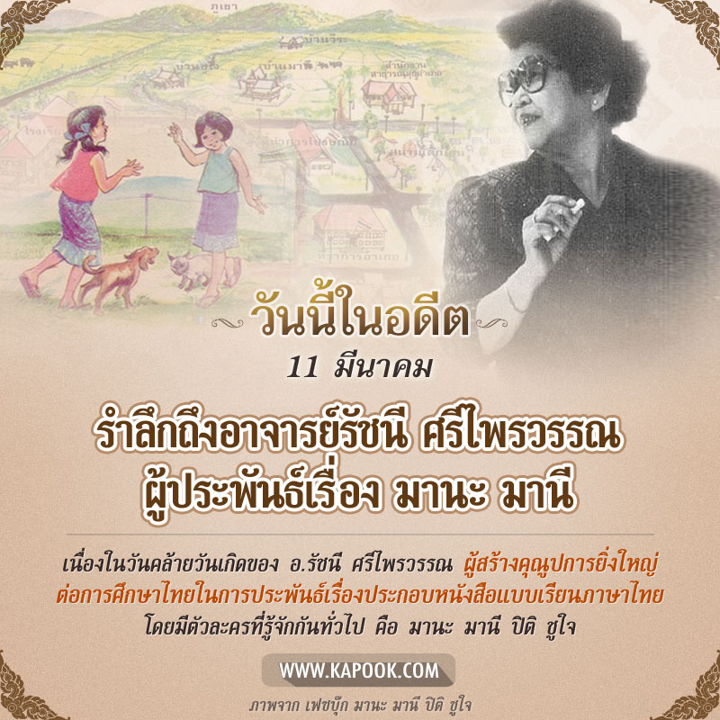 สำหรับประวัติ อาจารย์รัชนี ศรีไพรวรรณ เกิดเมื่อวันที่ 11 มีนาคม 2473 เป็นผู้สร้างคุณูปการยิ่งใหญ่ต่อการศึกษาไทยในวิชาภาษาไทยเป็นอย่างมาก ขณะรับราชการเป็นศึกษานิเทศก์ครูภาษาไทย ท่านได้รับมอบหมายจากสำนักวิชาการและมาตรฐานการศึกษา ในสำนักงานคณะกรรมการการศึกษาขั้นพื้นฐาน ให้เขียนเรื่องประกอบหนังสือแบบเรียนภาษาไทย ตามหลักสูตรประถมศึกษา พุทธศักราช 2521 ซึ่งเป็นที่รู้จักในชื่อ "มานะ มานี ปิติ ชูใจ" โดยนำมาใช้เป็นแบบเรียนตามหลักสูตรจวบจนถึงปี 2537 และเป็นผลงานที่ทำให้ท่านได้รับการยกย่องมาจวบจนถึงทุกวันนี้
