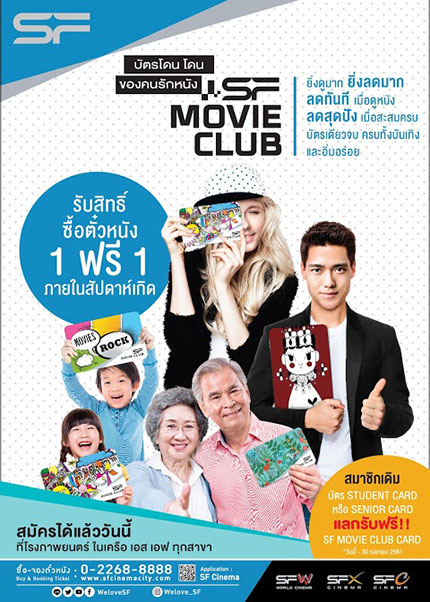 โรงภาพยนตร์ในเครือ เอส เอฟ มอบความคุ้มเพื่อคนรักหนังกับ "SF Movie Club Card" บัตรแทนเงินสดสำหรับซื้อบัตรชมภาพยนตร์ อาหารและเครื่องดื่ม พร้อมรับสิทธิ์ซื้อบัตรชมภาพยนตร์ในราคาพิเศษ นอกจากนี้!! ภายในสัปดาห์เกิดรับสิทธิ์ซื้อบัตรชมภาพยนตร์ทุกระบบ ทุกประเภท 1 ฟรี 1 ที่นั่ง ในราคาสมาชิก