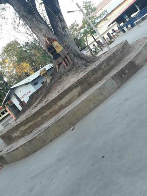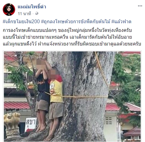 เพจดังเผยภาพ 2 เด็กชายถูกผู้ใหญ่ลงโทษหลังขโมยเงิน 200 บาท จับผูกมือ-ขึงพืดกับต้นไม้ประจานให้เพื่อนดู ถกสนั่นทำแบบนี้สมควรหรือไม่ ?
