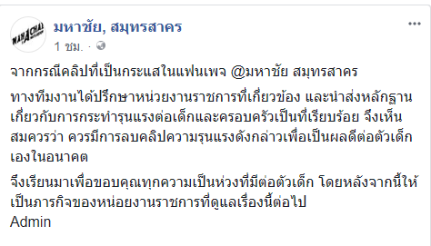 ซึ่งคลิปนี้เพจ มหาชัย, สมุทรสาคร เป็นคนนำมาโพสต์ครั้งแรก และลบไปแล้วเนื่องจากส่งคลิปเป็นหลักฐานให้หน่วยงานที่เกี่ยวข้องเรียบร้อยแล้ว หลังจากคลิปนี้แพร่ออกไป ก็มีเสียงวิพากษ์วิจารณ์ไม่หยุดถึงพฤติกรรมชายคนนี้ ซึ่งต้นสายปลายเหตุอาจยังไม่ทราบแน่ชัด แต่การทำร้ายร่างกายด้วยเหตุผลใด ก็ถือว่าไม่ควรทำอย่างมาก