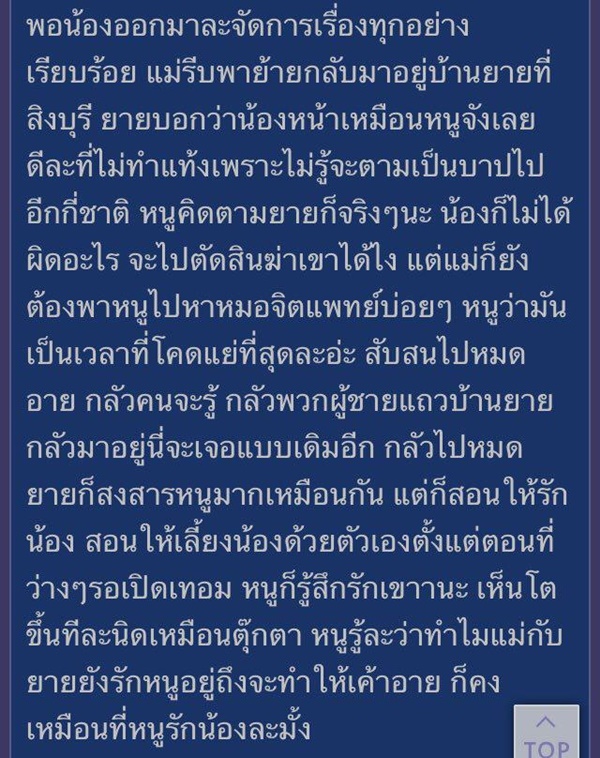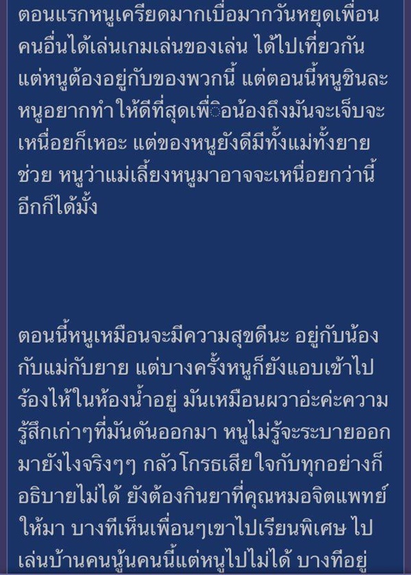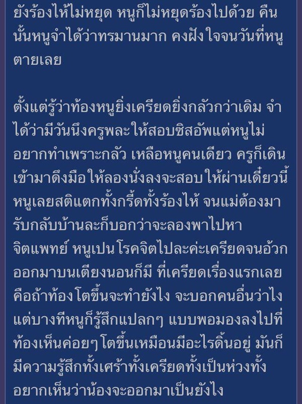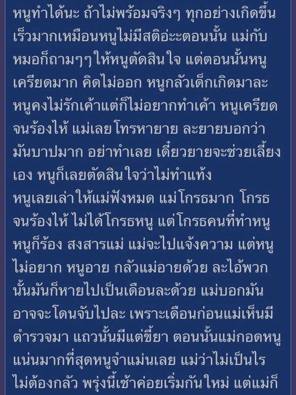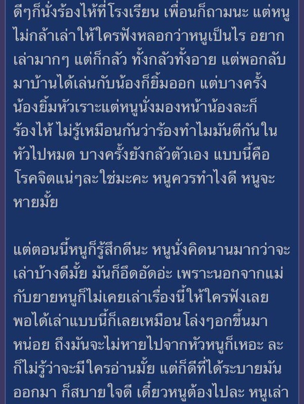 เธอกลัว อยากใช้ชีวิตเหมือนเพื่อนคนอื่น แต่เรื่องนี้มันก็ติดอยู่ในหัวตลอด แบบเป็นฝันร้ายไม่รู้เป็นโรคจิตมั้ย แม่พาไปหาหมอบ่อย ๆ ตอนนี้เธอกลายเป็นคนกลัวผู้ชายไปเลย ไม่อยากมีแฟนเหมือนคนอื่น ไม่กล้าคุยกล้าเล่นกับเพื่อนผู้ชาย บางทีถ้าเพื่อนมาเล่นใกล้ ๆ เธอก็จะกลัวไม่กล้าทำอะไร ตอนเรียนครูพละให้สอบซิทอัพแต่เธอไม่อยากทำเพราะกลัว พอเหลือเธอคนเดียว ครูก็เดินเข้ามาดึงมือให้ลองนั่งลงจะสอบให้ผ่านเดี๋ยวนี้ เธอเลยสติแตกทั้งกรี๊ดทั้งร้องไห้ จนแม่ต้องมารับกลับบ้าน และบอกว่าให้ลองพาไปหาจิตแพทย์ดู
