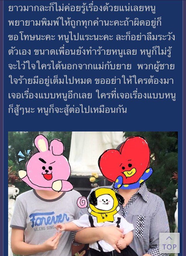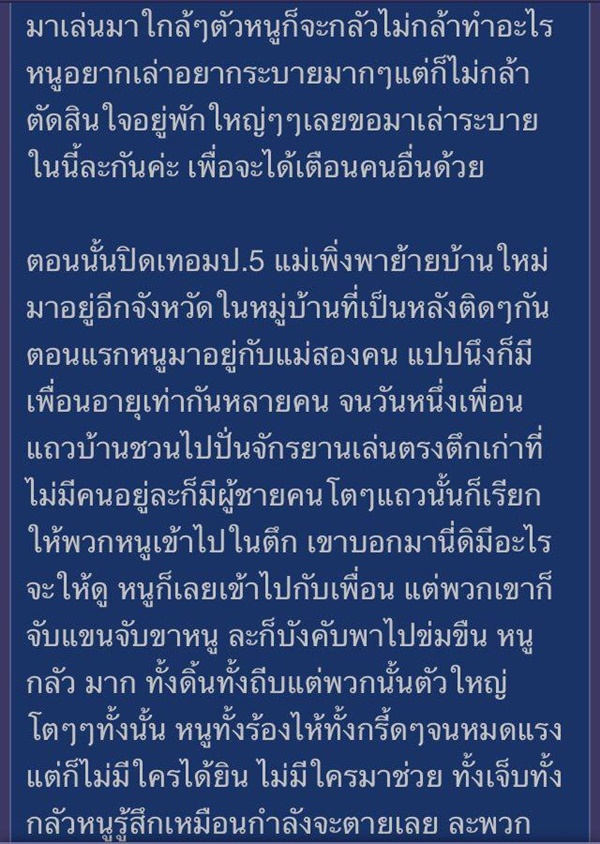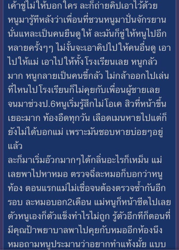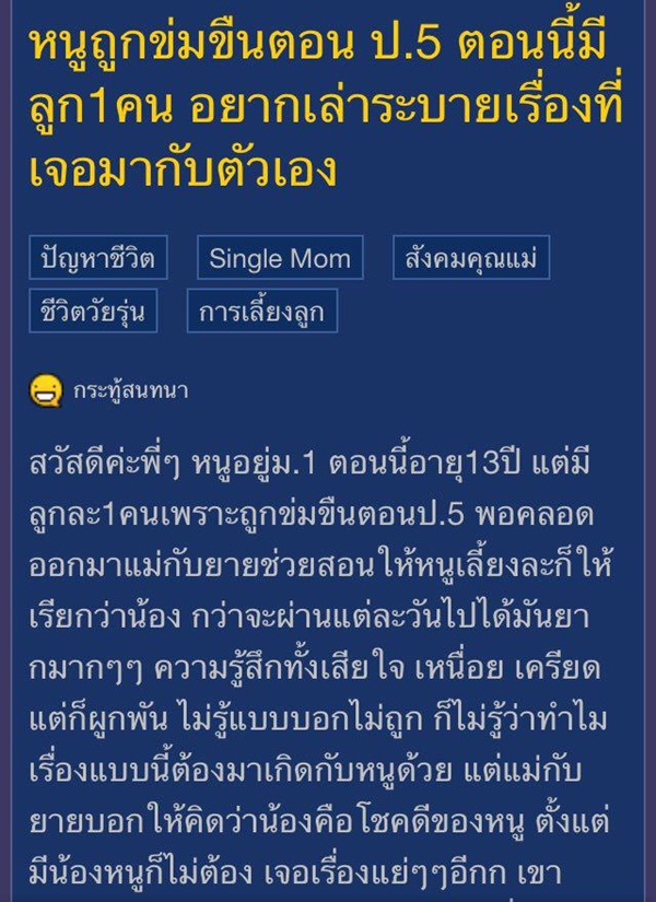 ขณะนี้ (25 มีนาคม 2561) โซเชียลได้มีการแชร์เรื่องราวสุดสลดของเด็กหญิงคนหนึ่ง ที่ตั้งกระทู้ "หนูถูกข่มขืนตอน ป.5 ตอนนี้มีลูก 1 คน อยากเล่าระบายเรื่องที่เจอมากับตัวเอง" โดยเล่าว่า ตอนนี้เธออายุ 13 ปี อยู่ชั้น ม.1 เคยถูกข่มขืนตอนอยู่ ป.5 แล้วคนร้ายถ่ายคลิปไว้ข่มขู่เธอด้วย จนเธอตั้งท้องตอน ป.6 พอคลอดออกมาแม่กับยายช่วยสอนให้เธอเลี้ยง แล้วให้เรียกลูกว่าน้อง ตอนนี้น้องอายุได้ 8 เดือนแล้ว ในแต่ละวันของเธอผ่านไปยาก ทั้งเสียใจ เหนื่อย เครียด แต่ก็ผูกพัน ไม่รู้ว่าทำไมเรื่องแบบนี้ต้องมาเกิดกับเธอด้วย