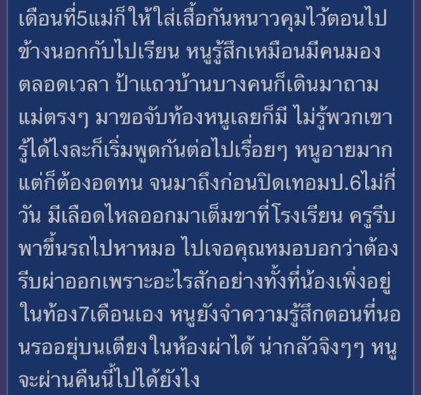 เด็กหญิงเล่าประสบการณ์สุดชอกช้ำ ถูกลวงไปข่มขืนตอน ป.5 แถมโดนข่มขู่-ถ่ายคลิป จนตั้งท้อง-คลอดลูก เผยแต่ละวันผ่านไปยากเหลือเกิน ท้อจนอยากตาย
